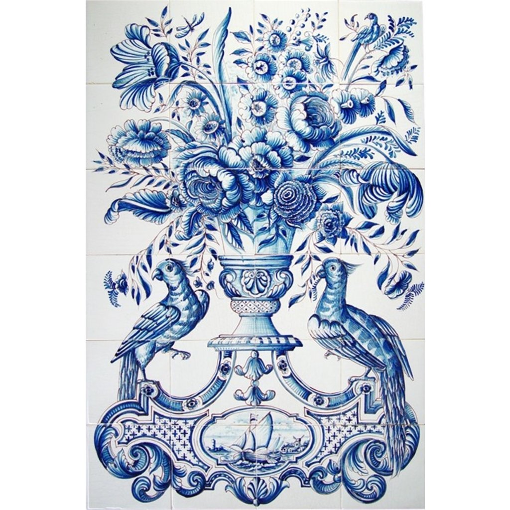 Tegeltableau bloemenvaas met papegaaien op een voetstuk met daarin een voorstelling van een bootje (ca.1775).