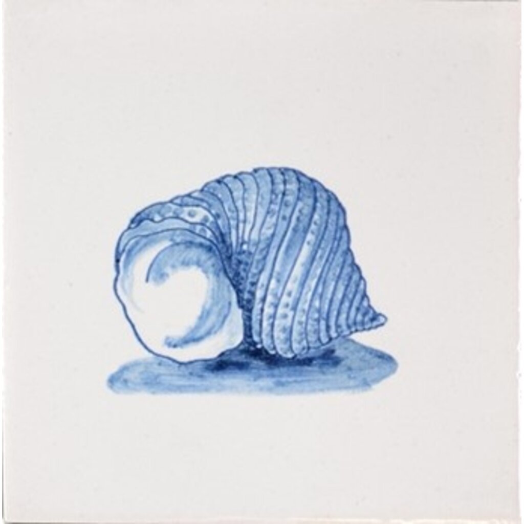 Fliesen mit Abbildungen von Muscheln in Blau, Größe 13x13 cm.