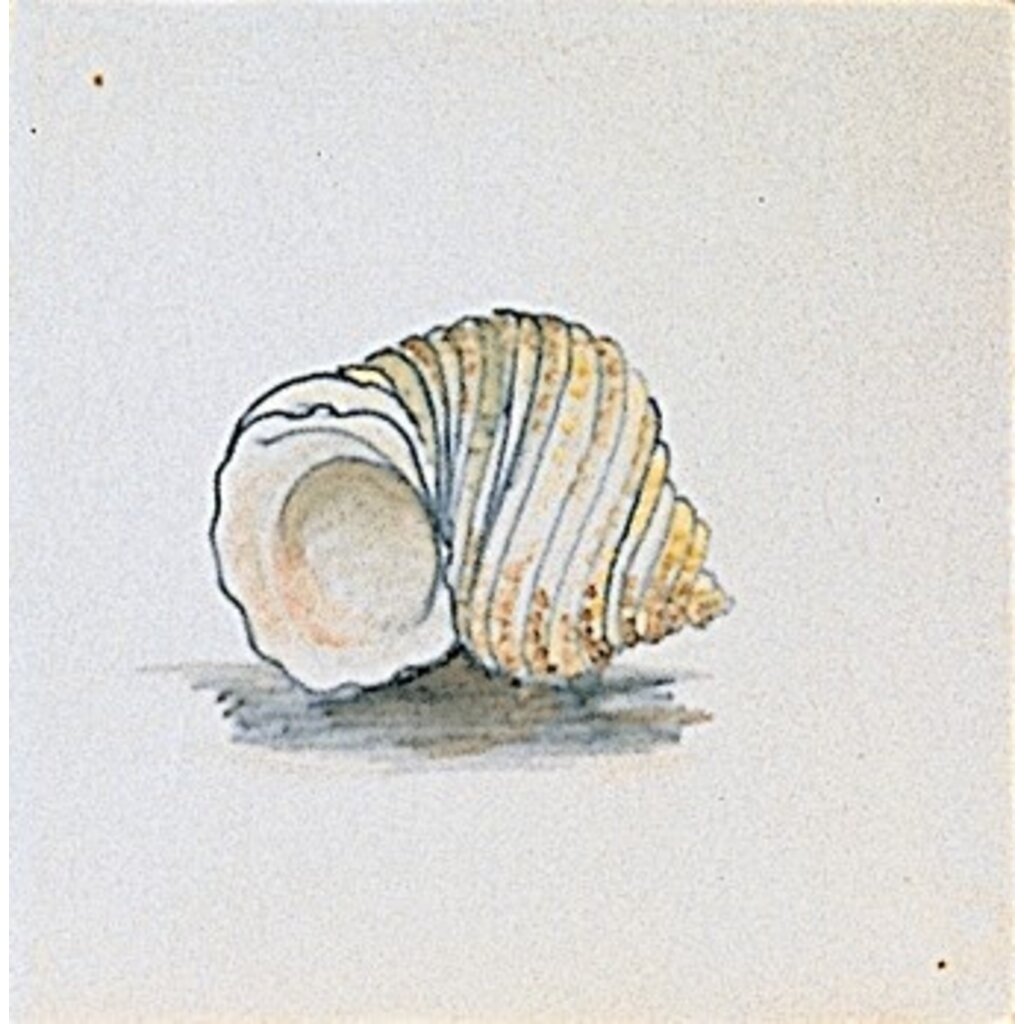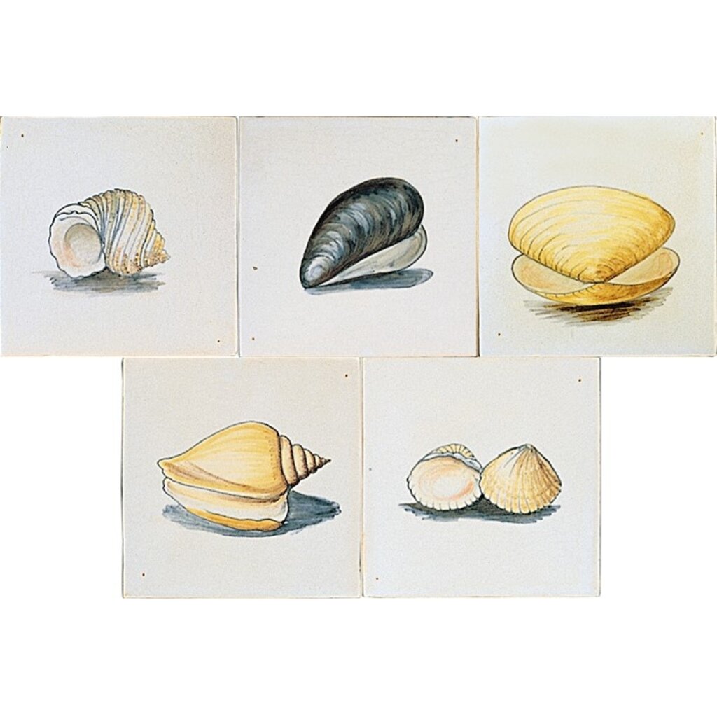 Fliesen mit Abbildungen von Muscheln in Farbe, Größe 13x13 cm.