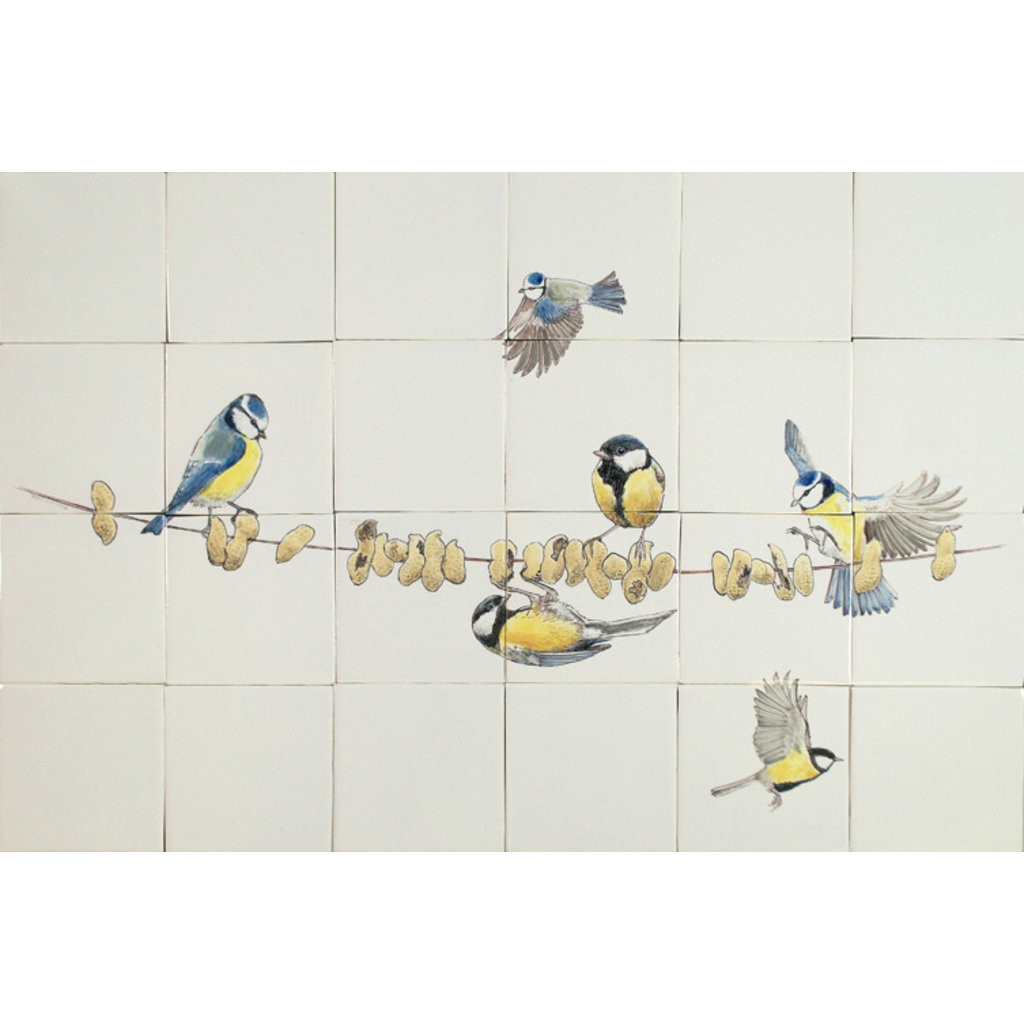 Fliesentableau mit Kohlmeisen und Blaumeisen an einer Erdnussschnur.