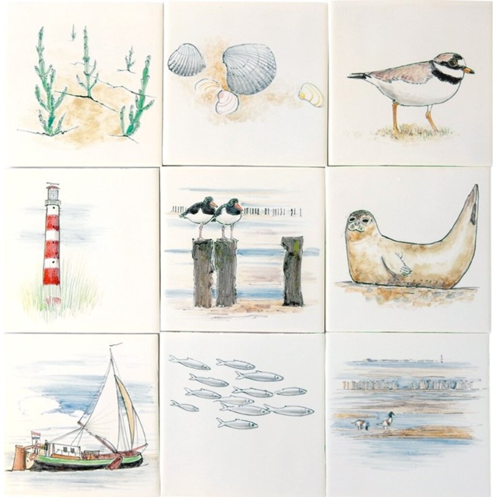 1 Samphire / 2 Shells / 3 Little plover / 4 Lighthouse Ameland / 5 Oystercatchers / 6 Seal / 7 Sailing ship / 8 Herrings / 9 Shelducks