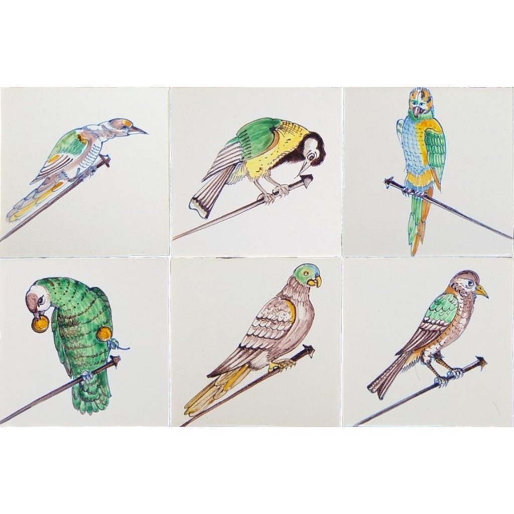 Wanneer u slechts enkele tegels van deze serie spijkervogels wilt kopen, kunt u telefonisch of per e-mail contact met ons opnemen. De prijs van een enkele tegel bedraagt € 55,00. De nummering is van linksboven naar rechtsonder.