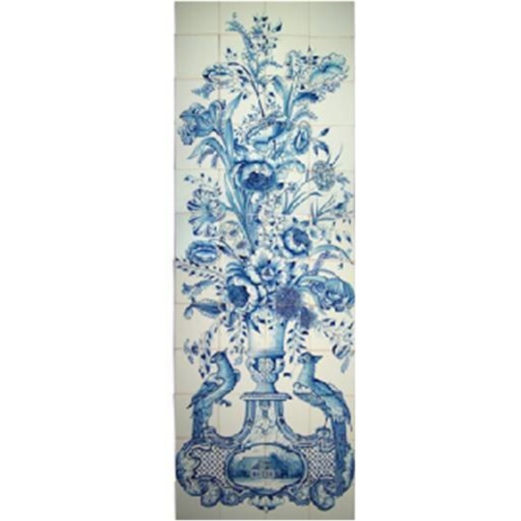Tegeltableau bloemenvaas met vogels op een voetstuk met daarin een voorstelling van een boerderij. Tegeltableau voor een schouw. (ca.1850).