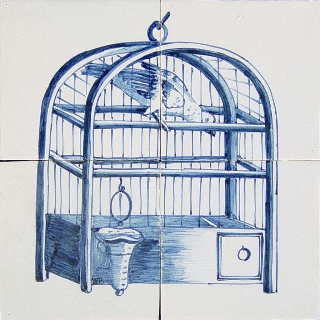 Tegeltableau vogelkooi met kanarie (Makkum, 18e eeuw).