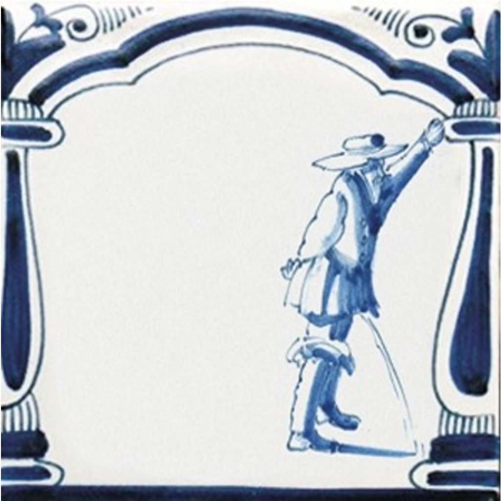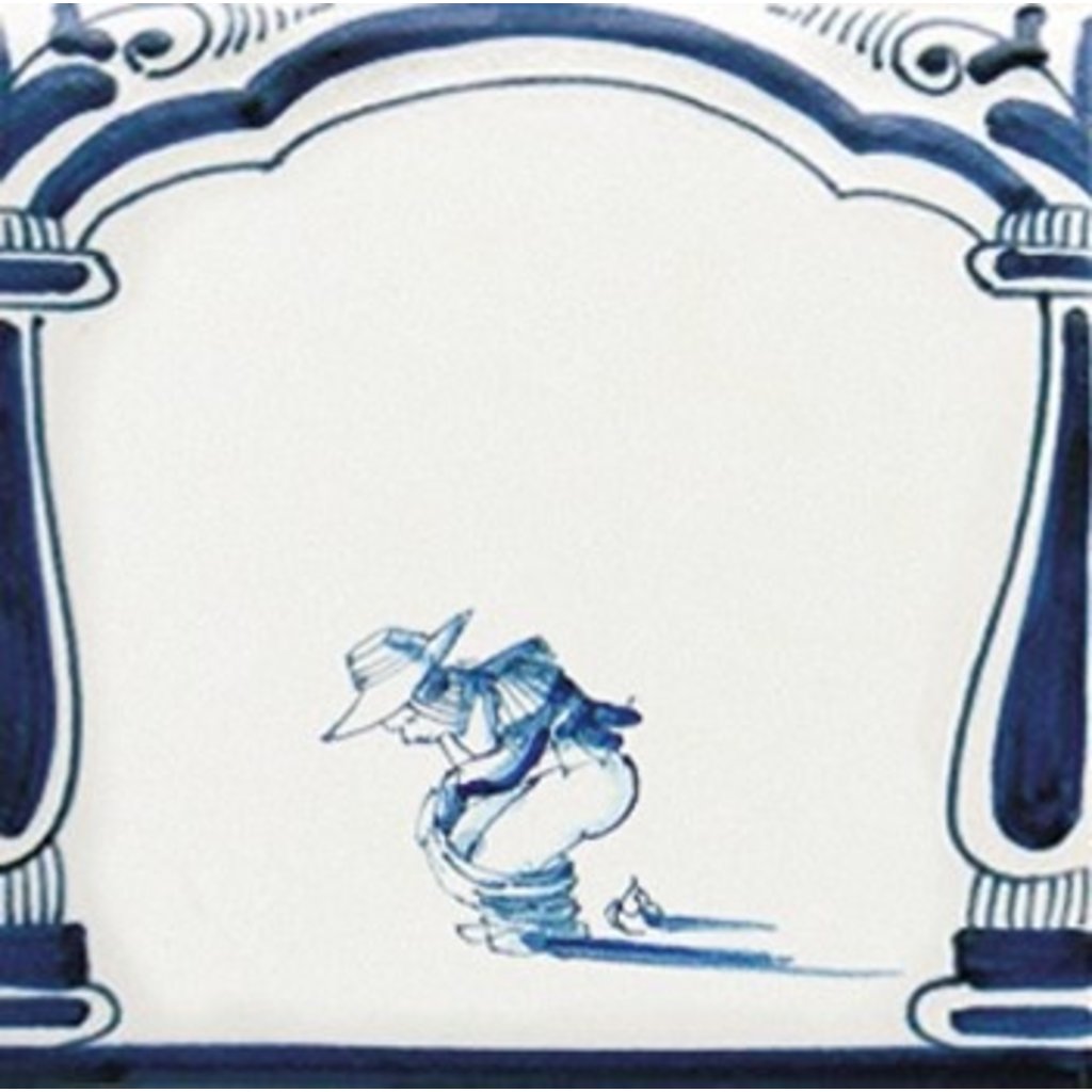 Tegels met plassers en kakkers in poort hoekmotief (ca.1650) in afmeting 13x13 cm.