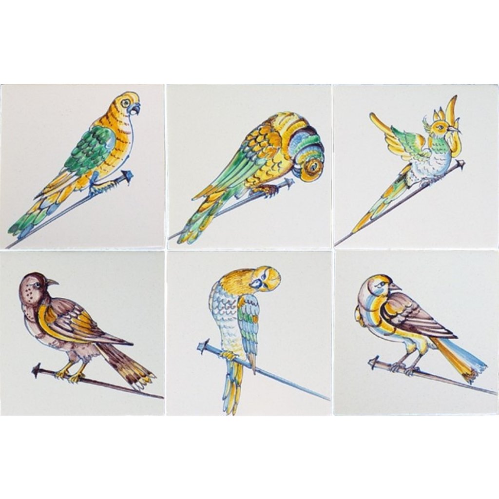 Wanneer u slechts enkele tegels van deze serie spijkervogels wilt kopen, kunt u telefonisch of per e-mail contact met ons opnemen. De prijs van een enkele tegel bedraagt € 55,00. De nummering is van linksboven naar rechtsonder.