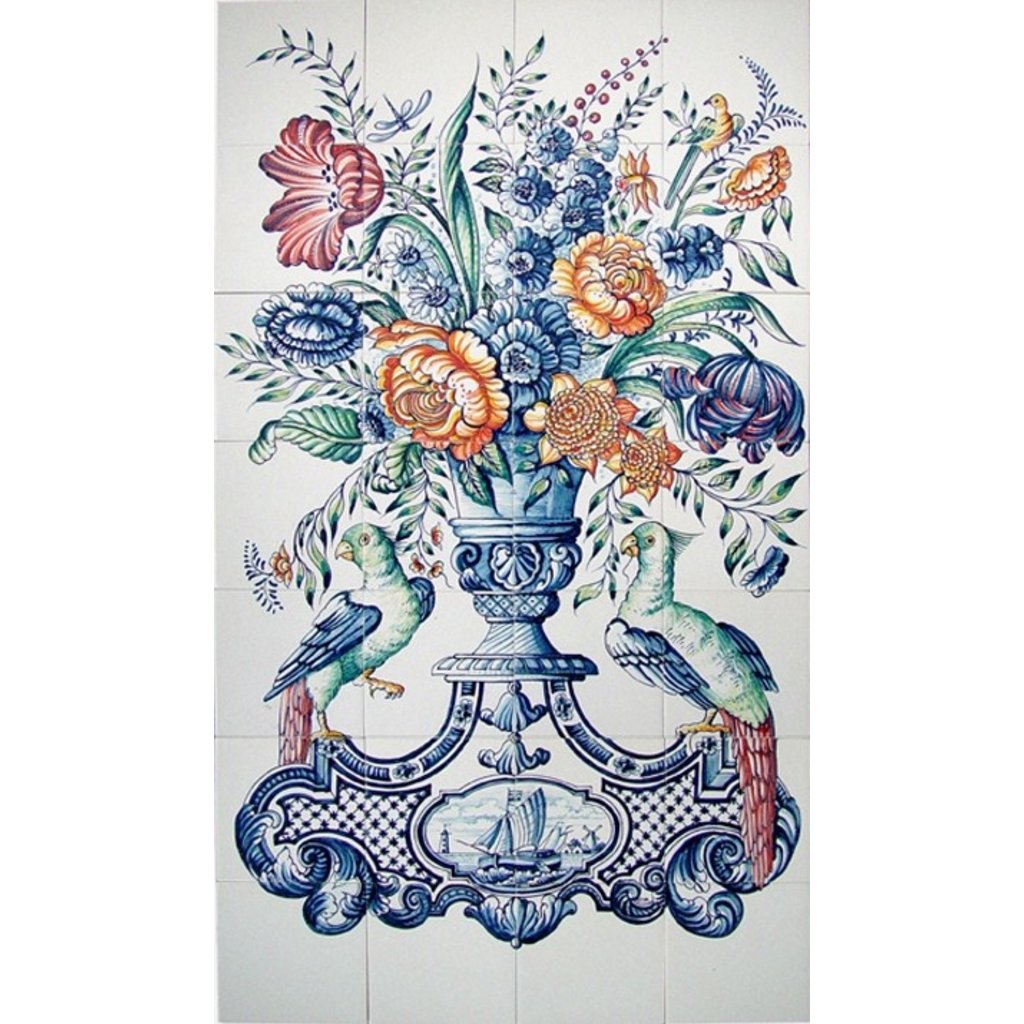 Tegeltableau bloemenvaas met papegaaien op een voetstuk met daarin een voorstelling van een bootje in kleur (ca.1775).